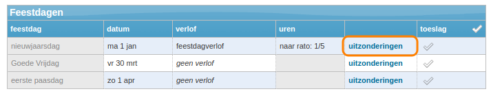 - Klik op 'uitzonderingen' om een uitzondering op de standaard feestdagregeling in te kunnen stellen.