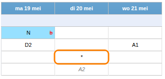In het week- of maandrooster kan er om deze redenen geen code worden getoond, zodat direct zichtbaar is om welke dienst het gaat. Klik op het sterretje om te zien welke taak en tijden gepland staan. Het personeelslid ziet de taak/taken en tijden ook doorkomen in het persoonlijke rooster in de app. Komt deze dienst vaker voor? Voeg dan eventueel een code toe via 'codes' om de weergave aan te passen.
