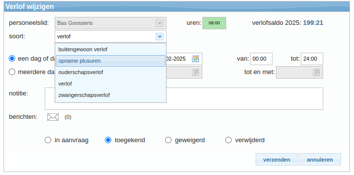 Via de pagina 'verlof' kan een personeelslid een 'niet-beschikbare' dag aangeven via de verlofsoort 'opname plusuren'. In de app kan een personeelslid dit aanvragen zodat deze uren niet van verlof af gaan maar van de opgebouwde plusuren. Een hoofdgebruiker kan dit ook invoeren of veranderen in de verlofaanvraag via de knop 'wijzigen' en dan de keuze te selecteren bij 'soort'. Voorbeeld: