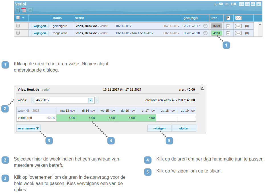 Soms is het nodig om verlofuren aan te passen. Een voorbeeld hiervan is dat iemand 4 uur verlof hoeft in te leveren in plaats van 8 uur, omdat er ook een halve dag is gewerkt.