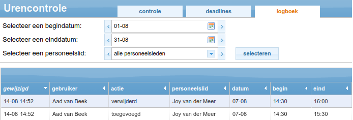 Om te kunnen zien door wie er wijzigingen zijn aangebracht op de pagina 'urencontrole', is er een logboek beschikbaar. Op deze pagina wordt getoond door wie welke uren zijn geaccordeerd of gewijzigd. Zodra deze optie is toegevoegd, kan een hoofdgebruiker met adminrechten het tabblad 'logboek' inzien.
